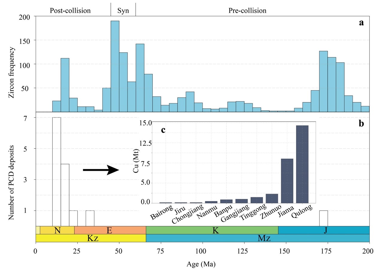 图1(a)冈底斯岩浆锆石年代学频率分布(b)中新世斑岩铜矿床数量(c)及主要矿床铜金属储量