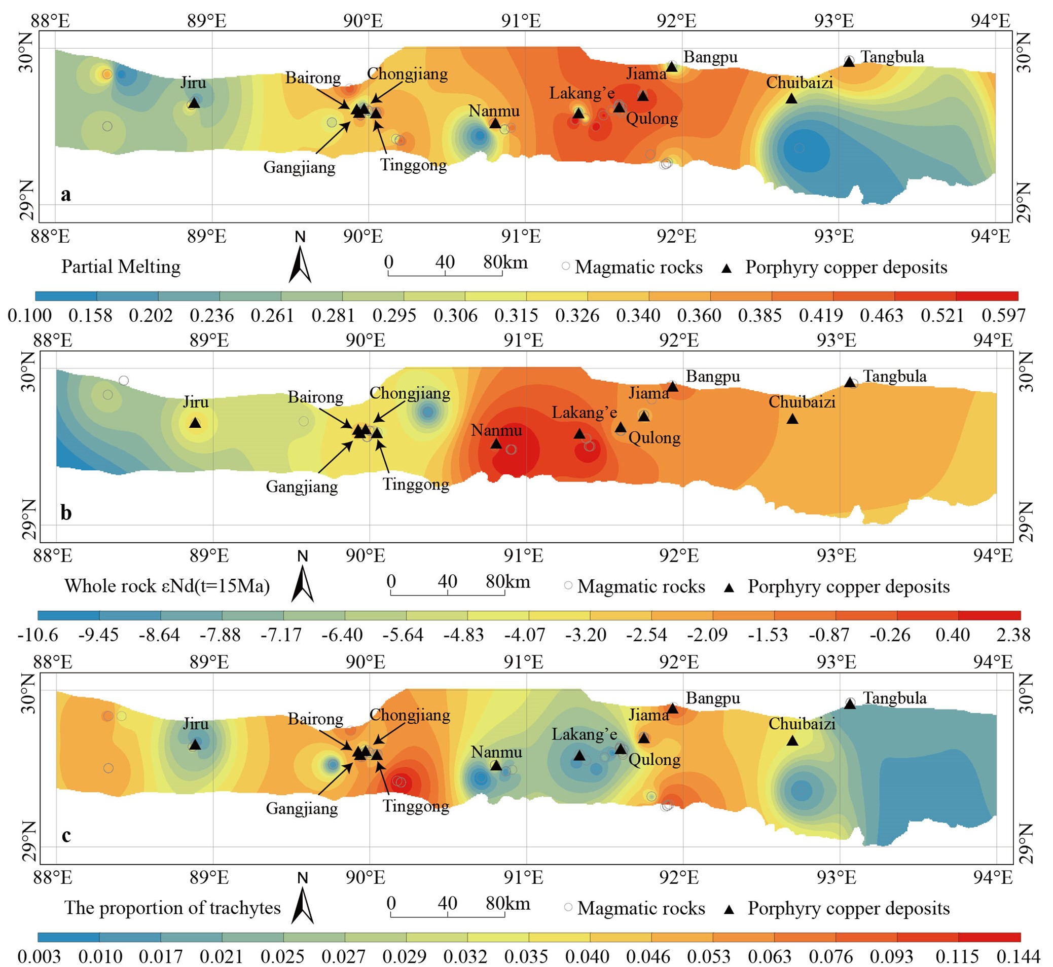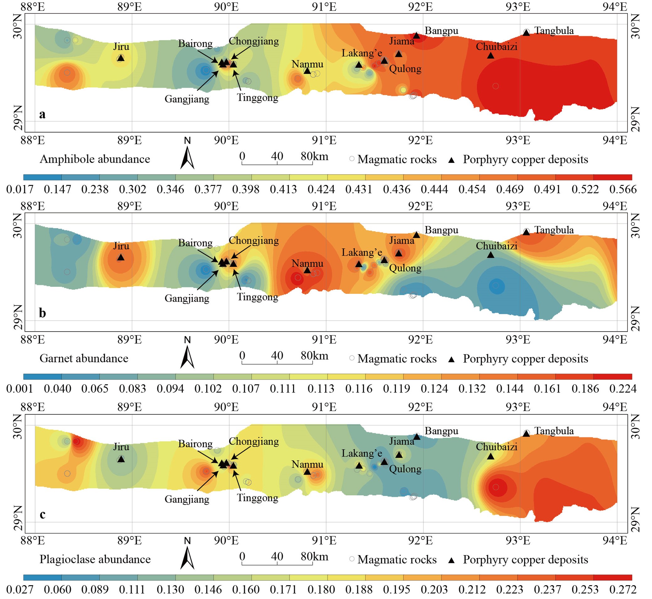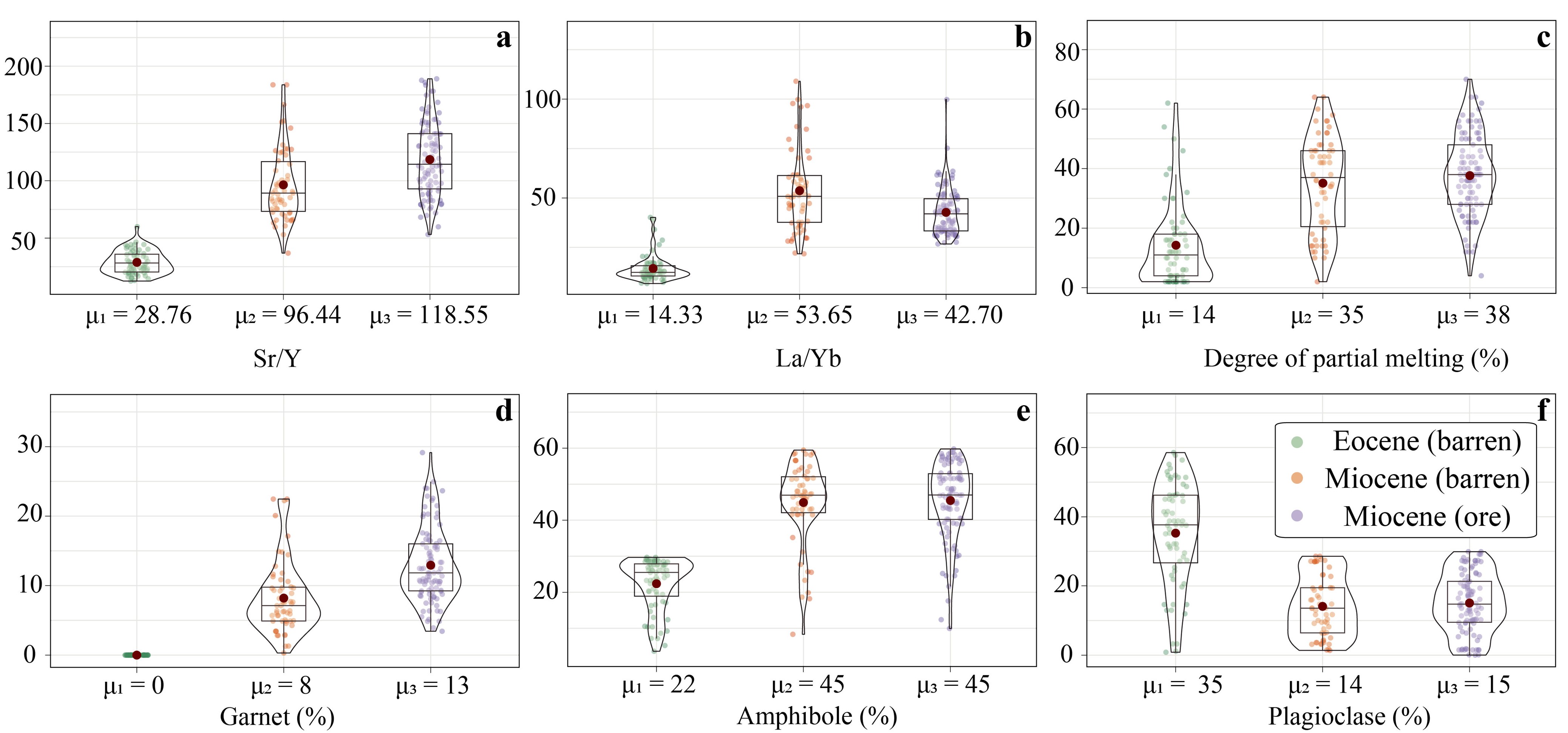 1. 下地壳熔融程度自始新世向中新世显著提升,同时下地壳矿物组合由斜长石主导向角闪石-石榴石主导演化(图2),且具有高角闪石-石榴石含量、低斜长石含量的区域与已知大型斑岩铜矿床的空间分布呈现显著对应关系(图3)。