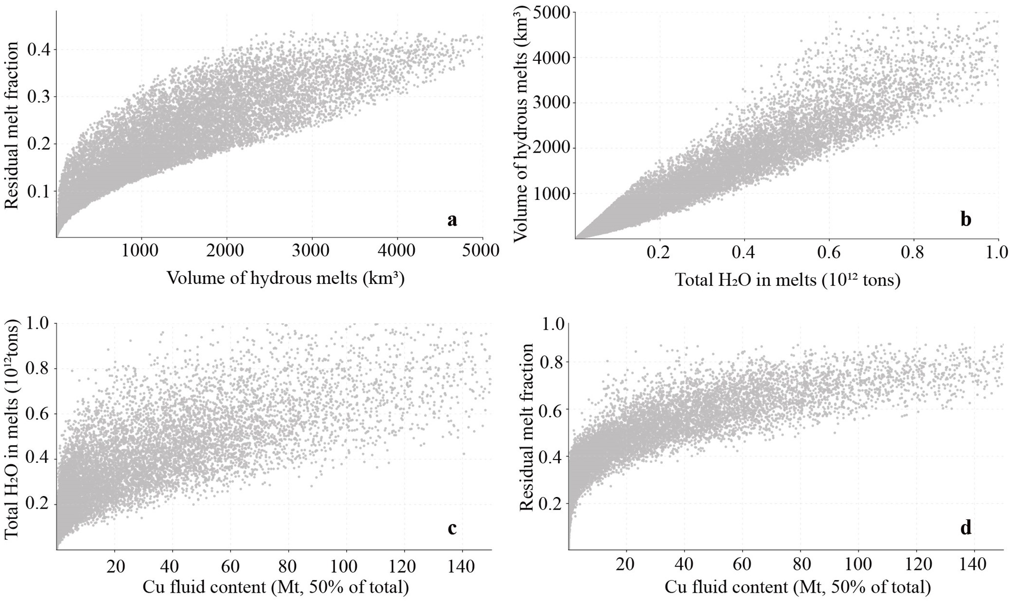 图5 俯冲型斑岩铜矿成矿过程的控制机制模拟分析图。基于蒙特卡洛模拟分析以下关键变量间的相关关系:(a)残余熔体比例vs富水岩浆体积;(b)富水岩浆体积vs岩浆含水量(吨位);(c)岩浆含水量(吨位)vs铜矿吨位(50%沉淀效率);(d)残余熔体比例vs铜矿吨位(50%沉淀效率)。