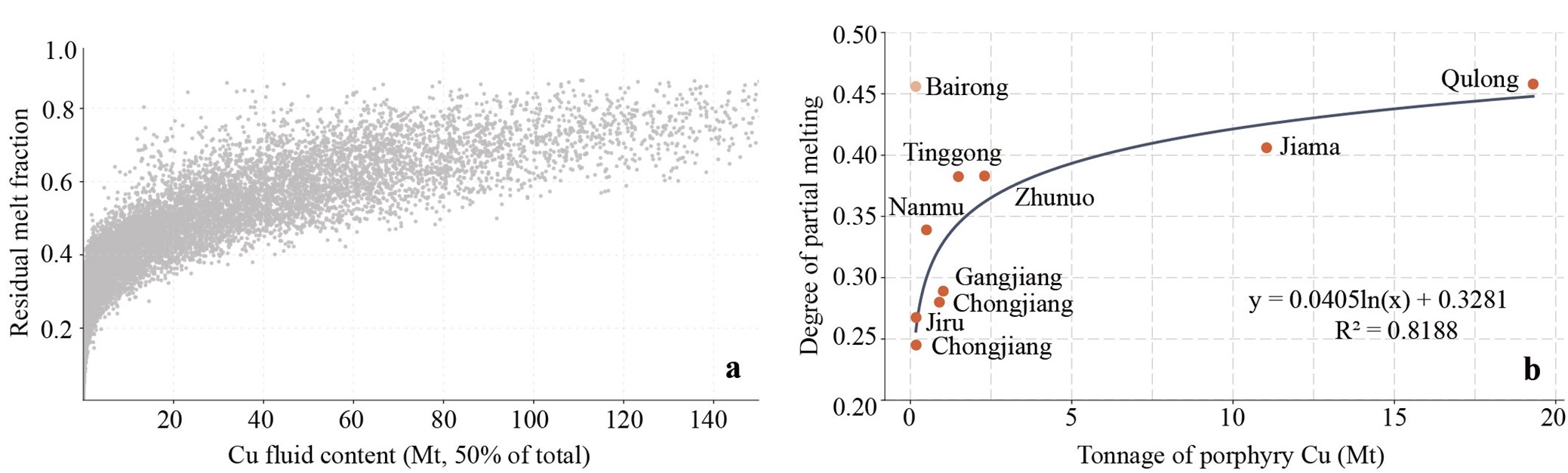 图6 俯冲与碰撞背景下斑岩铜矿储量控制机制的定量分析图。(a)俯冲背景下残余熔体比例与铜矿吨位的模拟关系;(b)碰撞背景下部分熔融程度与斑岩铜矿吨位的对数拟合关系图