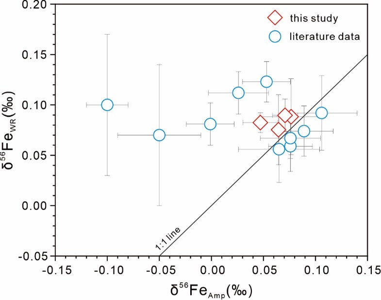 图1 本研究和文献中角闪石及其对应全岩δ56Fe值对比