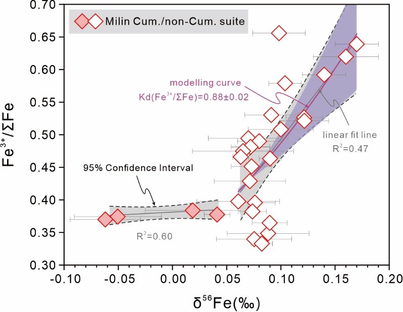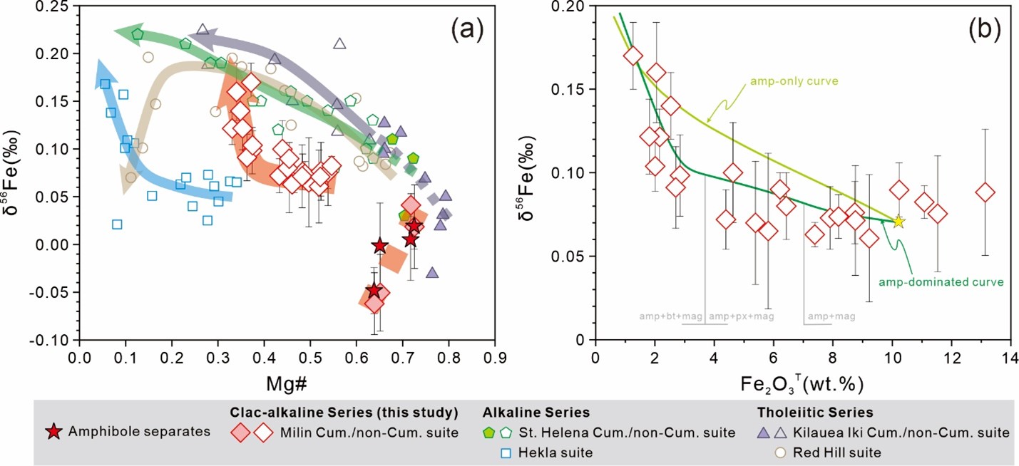 (2)基于前人报道的分馏系数建立的瑞利分馏曲线再现了非堆晶岩石的δ56Fe变化趋势,这说明大陆弧岩浆发生以角闪石为主导的分异可以驱使残余熔体向更重的Fe同位素组成演化(图2)。