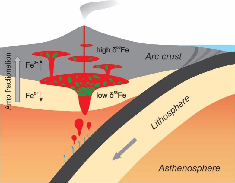 (3)非堆晶岩的δ56Fe与Fe3+/ΣFe呈现正相关趋势,且非堆晶岩与堆晶岩表现出互补的演化趋势(图3),表明角闪石在弧岩浆体系中分异产生的氧化效应是导致Fe同位素分馏的根本原因,即角闪石分异存在岩浆自氧化效应(图4)。