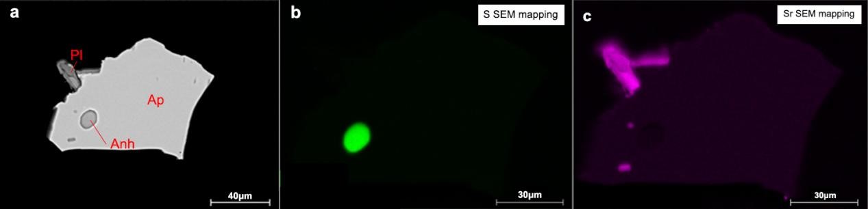 (2)开展了硫化物/石膏在不同氧逸度下结晶的S同位素数值模拟(图3a,b),并考虑了磷灰石与熔体的分馏系数(图3c,d)。模拟结果表明,甲玛成矿斑岩的磷灰石δ34S比S含量数据可以较好地由低氧逸度下硫化物的分离结晶、以及高氧逸度下石膏的分离结晶进行解释(图3c,d),但低氧逸度不符合成矿岩浆实际,因此高氧逸度的石膏分离结晶是最合理的解释。这一点同样可以由发现于甲玛磷灰石中的石膏包裹体佐证(图4)。