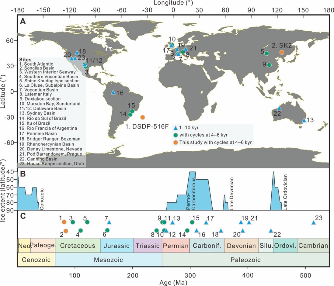 基于晚白垩世松辽盆地干–湿气候重建结果与理论赤道辐射计算,研究表明:气候岁差参数,即缓慢变化的轨道尺度太阳辐射强迫,能够激发周期约为~5 kyr的高频气候事件。高阶谱分析进一步表明,这些~5kyr信号还可以通过非线性过程衍生出1.8-4kyr的更高频气候震荡(图2D&E)。这意味着,白垩纪陆相沉积记录中所观测到的千年尺度气候振荡,几乎均可归因于天文岁差参数的作用。