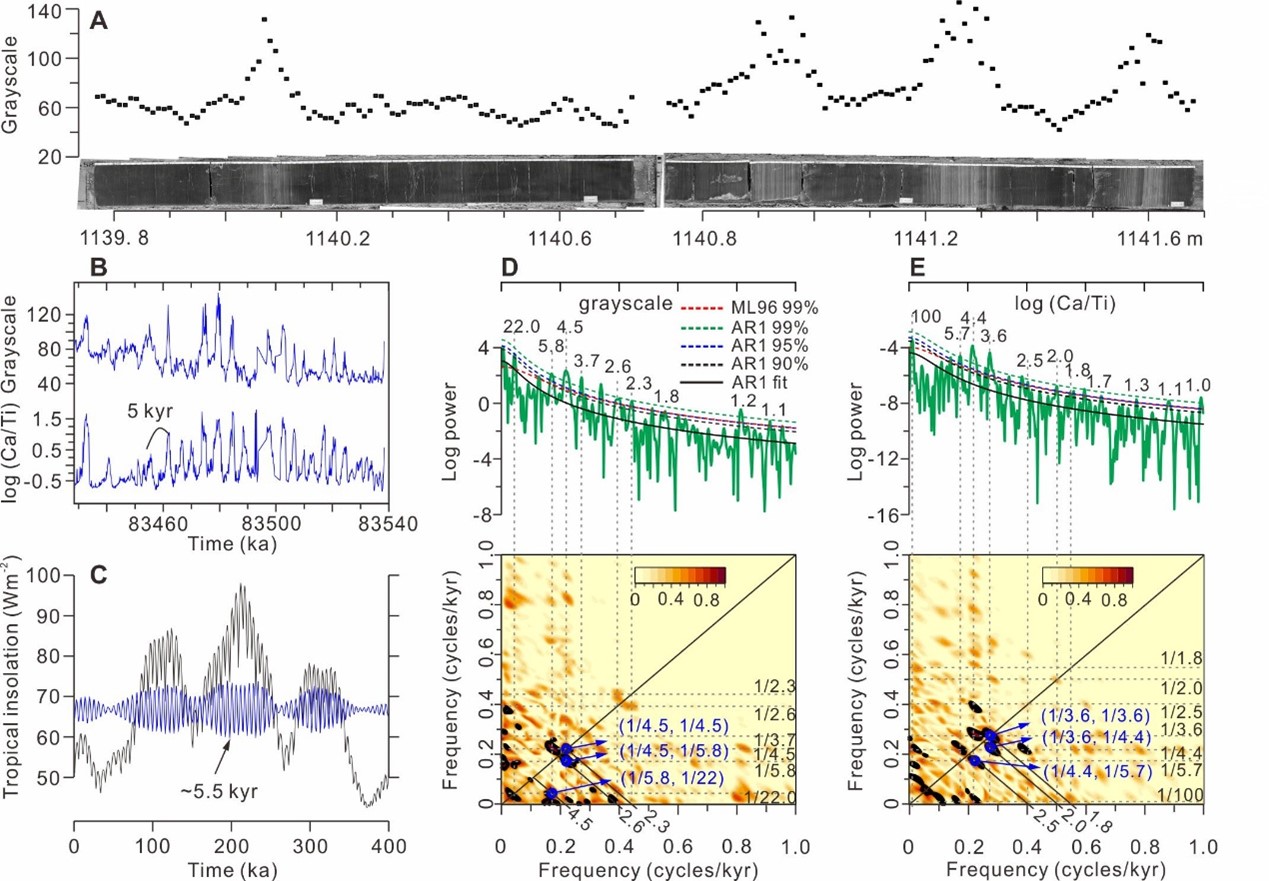 图2. 松辽盆地晚白垩世千年尺度干湿气候重建及其解释机制。A, 基于松科二井岩心材料获取高分辨率灰度序列过程; B, 松辽科钻岩心记录的~5kyr尺度干–湿气候旋回; C, 赤道太阳辐射理论曲线及产生的5千年周期信号; D&E, 灰度及Ca/Ti时间序列的谱分析及高阶相干性谱分析。