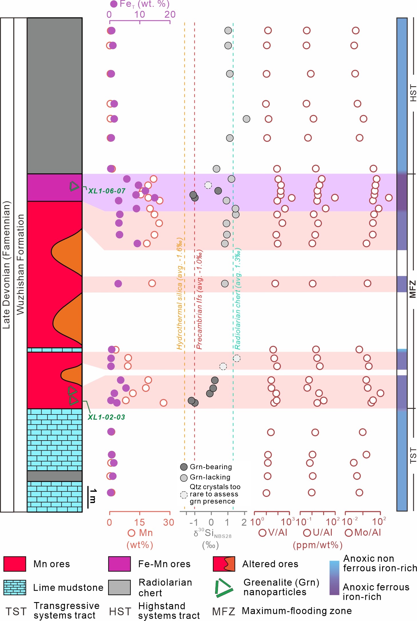 针对这一科学问题,开云电竞下载官网(北京)陈方戈副教授、王庆飞教授、邱昆峰教授和邓军教授等团队成员,联合加拿大女王大学Peir K. Pufahl教授、卡普顿大学Edward J. Matheson副教授、中国科学院广州地球化学研究所鲜海洋研究员、席佳鑫博士后、中国科学院南京地质古生物研究所南景博副研究员和广西第四地质队阮荻高工,对华南板块西南缘上泥盆统下雷锰矿开展了层序地层学、矿物学、扫描电镜、透射电镜、全岩元素和碳-硅同位素地球化学等综合研究,取得如下新认识: