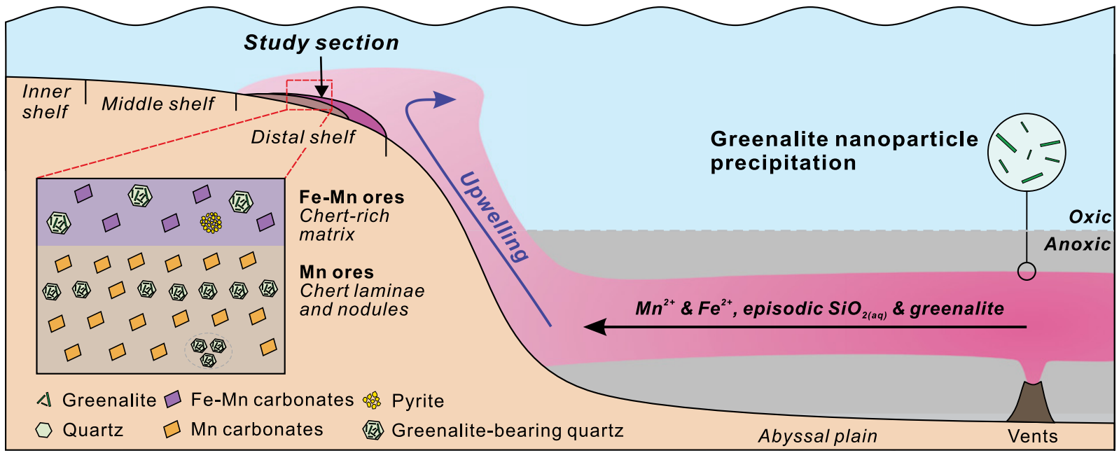 本研究得到国家自然科学基金青A项目(42125203)和青C项目(42202083)、国家重点研发计划(2022YFC2903403)、广西地矿局地质科研项目(GXGS202505)、江西省自然科学基金(20242BAB27002)和加拿大NSERC等项目联合资助。发表在国际权威期刊《Geology》:Fangge Chen, Qingfei Wang*, Peir K. Pufahl, Edward J. Matheson, Kunfeng Qiu, Haiyang Xian, Jingbo Nan, Jiaxin Xi, Di Ruan, Haoying Chen, Xinwei Hu, Huan Ma, Jun Deng*. 2025. Greenalite as a record of hydrothermal input and ocean anoxia, Late Devonian Xialei Mn deposit, South China. Geology.