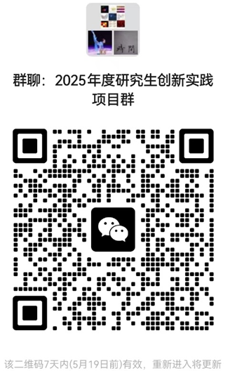 研究生院联系人:办公楼412室,纪老师。电话:82323959。为便于沟通管理,请所有项目负责人及项目组成员手机微信扫描下图二维码加入2025年度研究生创新实践项目群: