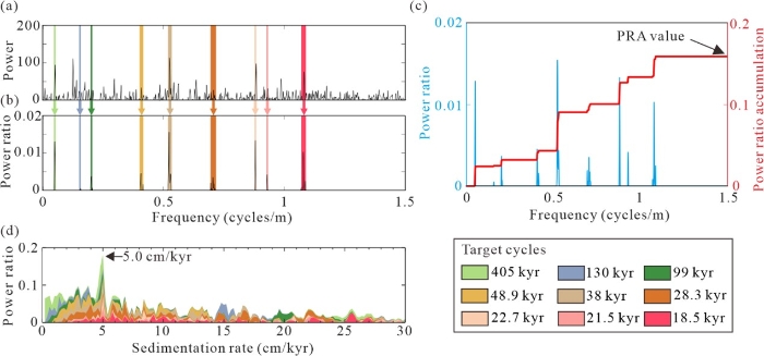 2、地球物理测井数据对轨道尺度气候的敏感性可能受到地质事件、相对应关系稳定性和井眼环境等多种因素的影响。联合频谱分类与能量比累加分析,能够实现多种地球物理测井数据的敏感性评价与替代指标优选(图2)。