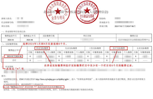 要求考生到“北京市人力资源和社会保障局官网”上查询打印,缴费起止年月选择2024年1月到2024年9月之间的任意连续6个月(如:2024.01-2024.06、2024.02-2024.07、2024.04-2024.09),上传时需对网站上下载生成的《参保人员缴费信息》PDF文件进行截图上传(文件中应带有“北京市社会保险基金管理中心业务专用章”和“北京市医疗保险事务管理中心个人权益专用章”),缴费明细部分中,缴费起止年月栏目中不能带有“*”号标识,在养老实际缴费和医疗实际缴费栏目中至少有一个栏目有6个月的缴费记录。示例如下图: