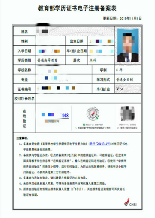 《教育部学籍在线验证报告》和《教育部学历证书电子注册备案表》样例: