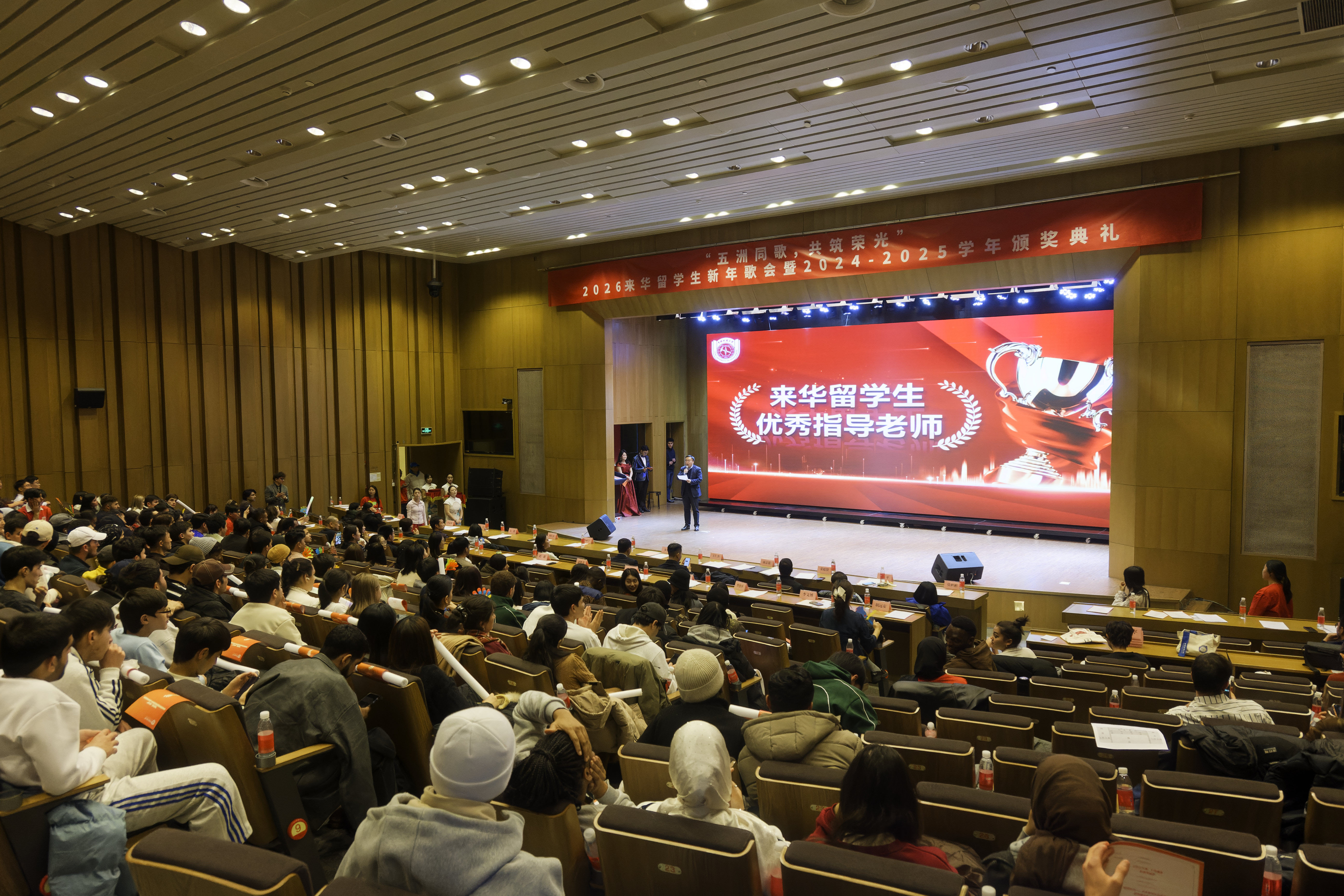 12月12日,“五洲同歌,共筑荣光”2026来华留学生新年歌会暨2024-2025学年颁奖典礼举办。校党委副书记多宏宇、北京市公安局海淀分局出入境管理大队王仁杰、中关村街道华清园社区党委副书记冯丽宇出席活动。