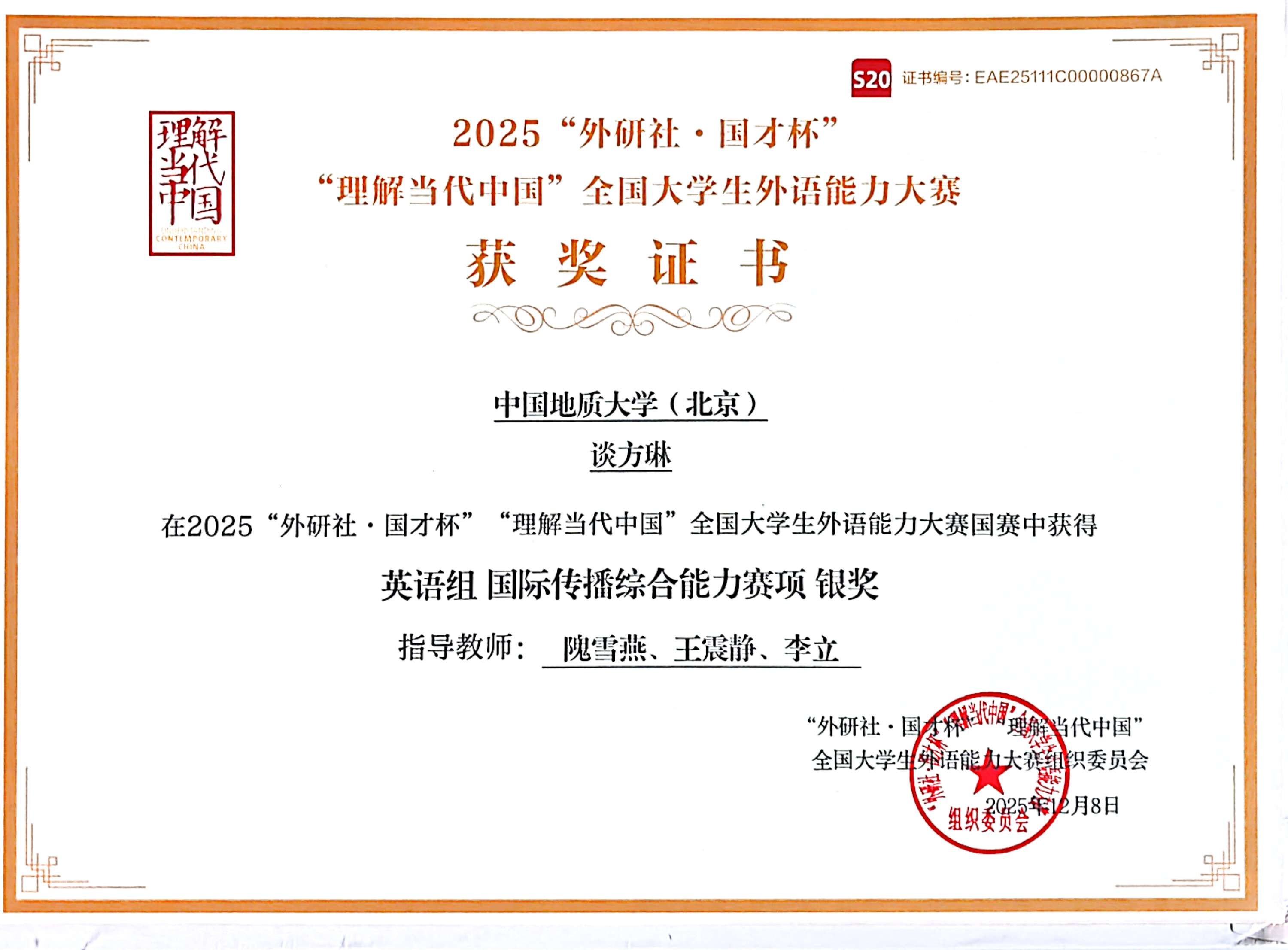 近日,2025年“外研社·国才杯”“理解当代中国”全国大学生外语能力大赛举行。我校外国语学院2023级本科生谈方琳在英语组国际传播综合能力赛项中表现出色,荣获全国银奖,创造了我校在该项赛事的历史最佳成绩。